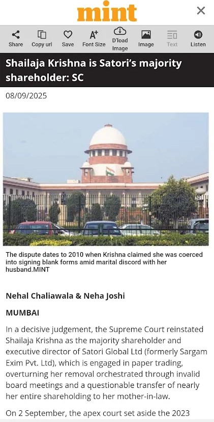 Supreme Court restores Shailaja Krishna as Satori Global’s majority shareholder